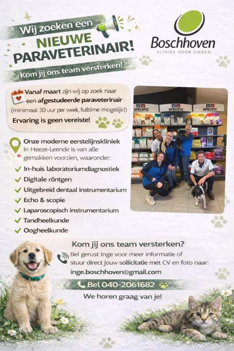 Vanaf maart zijn wij bij Boschhoven – Kliniek voor Dieren op zoek naar een enthousiaste paraveterinair die ons team komt versterken.